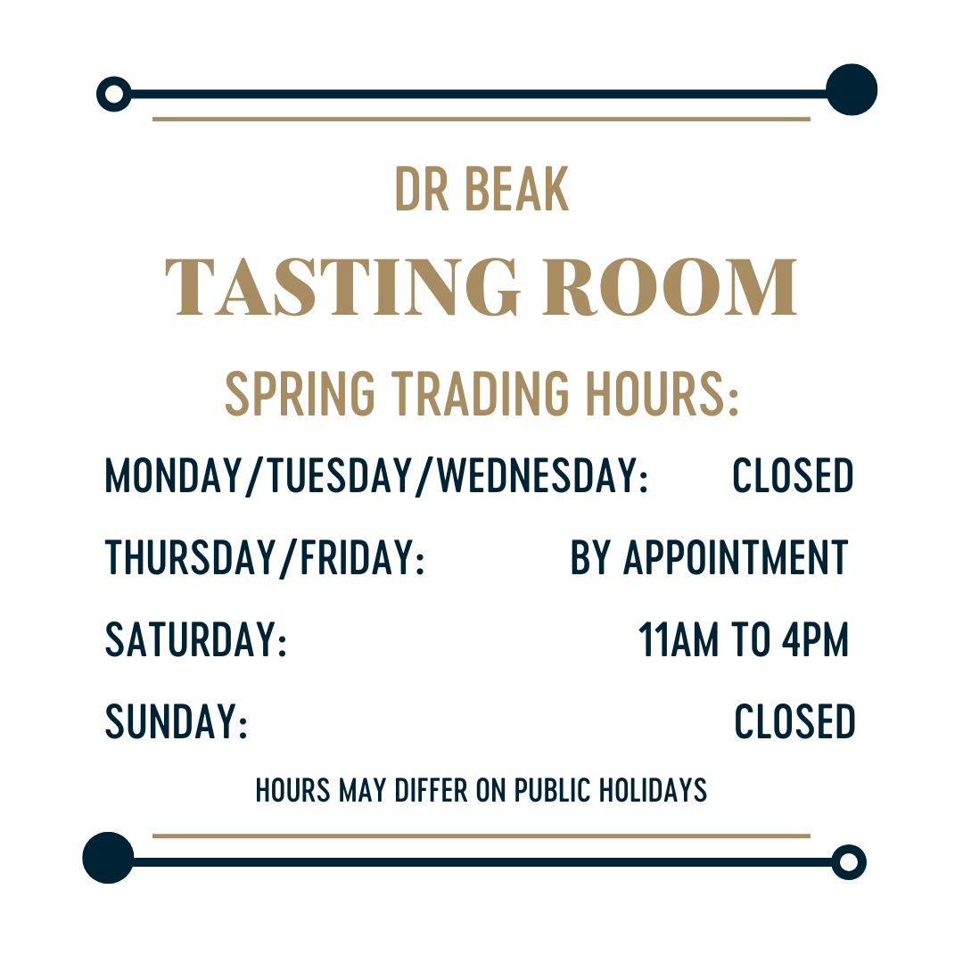 Please note: Tastings are for those 18 years or older. Please email us at info@drbeak.nz if you would like to book in a group of more than 6 people. Tasting timeslots are for 45 minutes; if you are running late for your booking please notify us, we will do our best to accommodate you, however we reserve the right to cancel the booking.